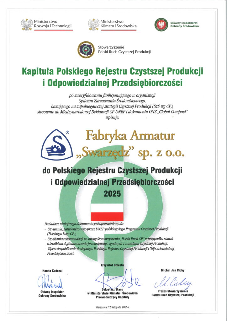 Z przyjemnością informujemy również, że Kapituła Polskiego Rejestru Czystszej Produkcji i Odpowiedzialnej Przedsiębiorczości, obradująca 12 listopada 2025 r. w Ministerstwie Klimatu i Środowiska, zdecydowała o przedłużeniu wpisu naszej firmy w Rejestrze w jego kolejnej edycji.